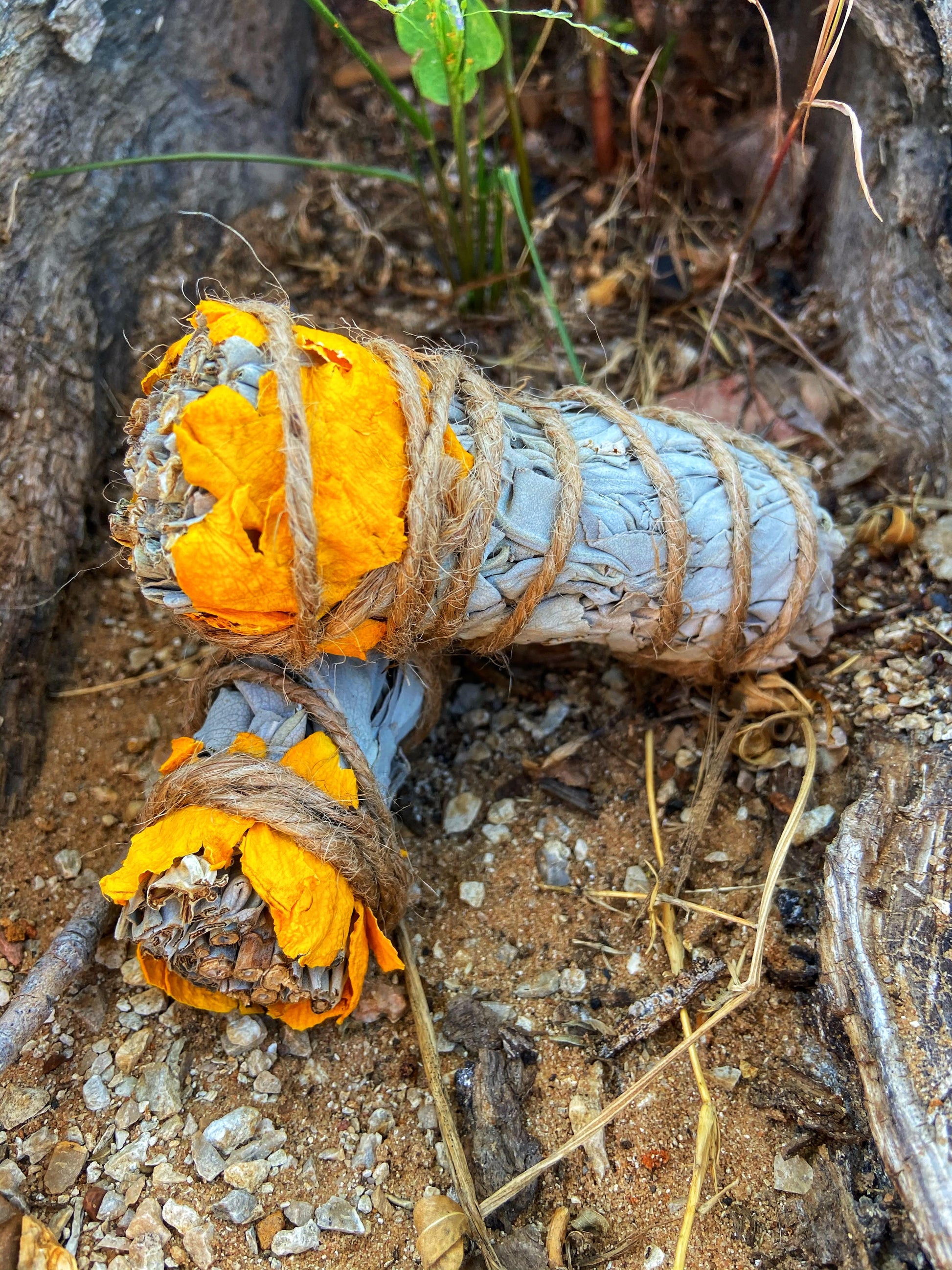 White Sage Smudge Wand twined with roses. Rose colors may vary depending on season and floral availability.